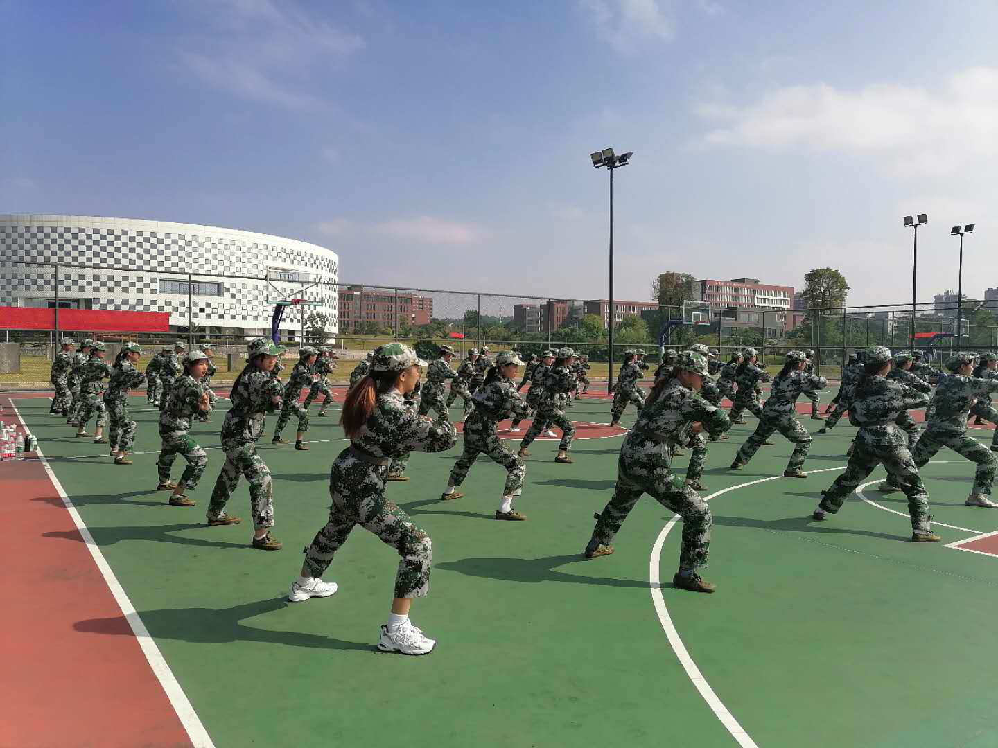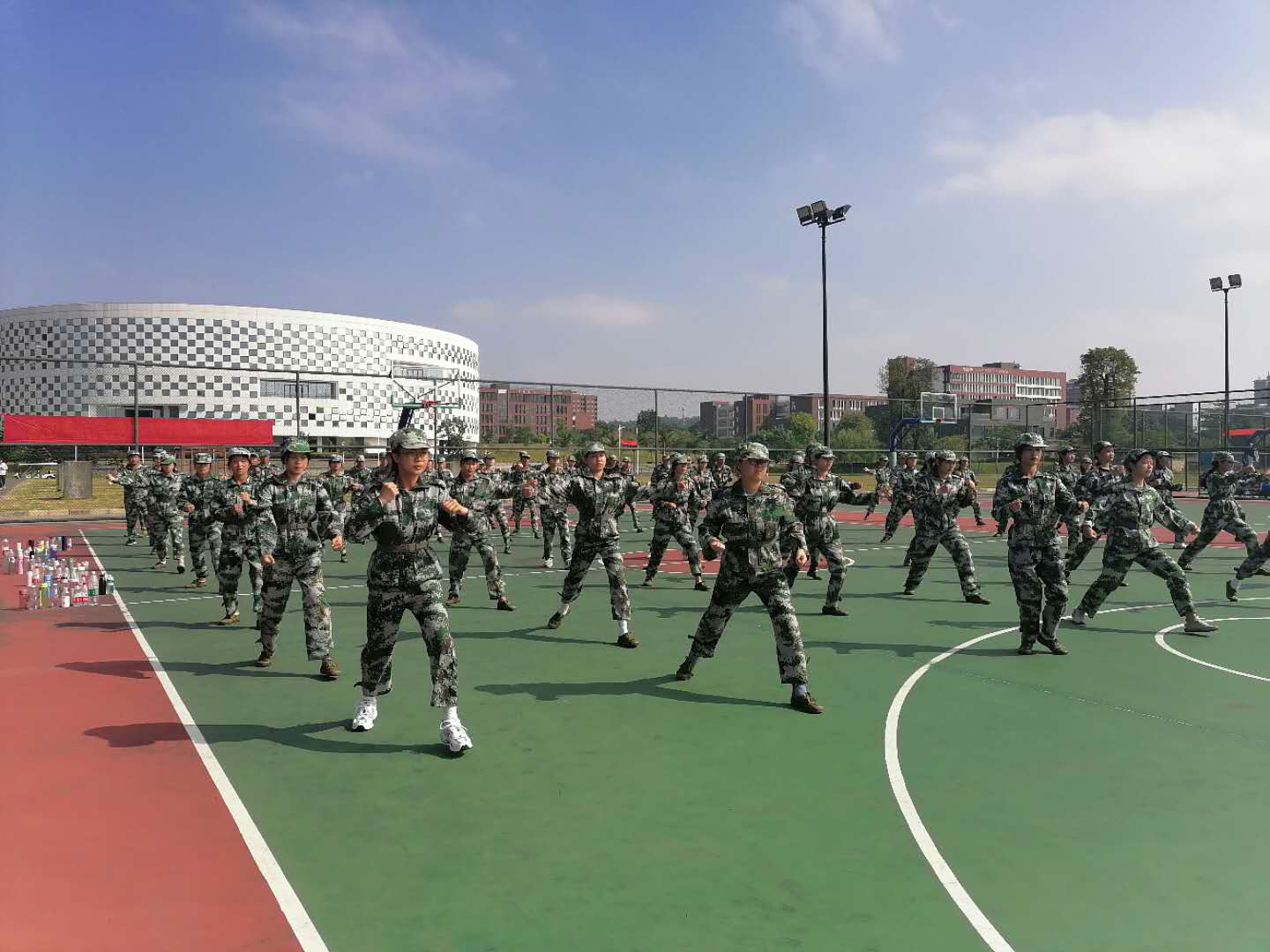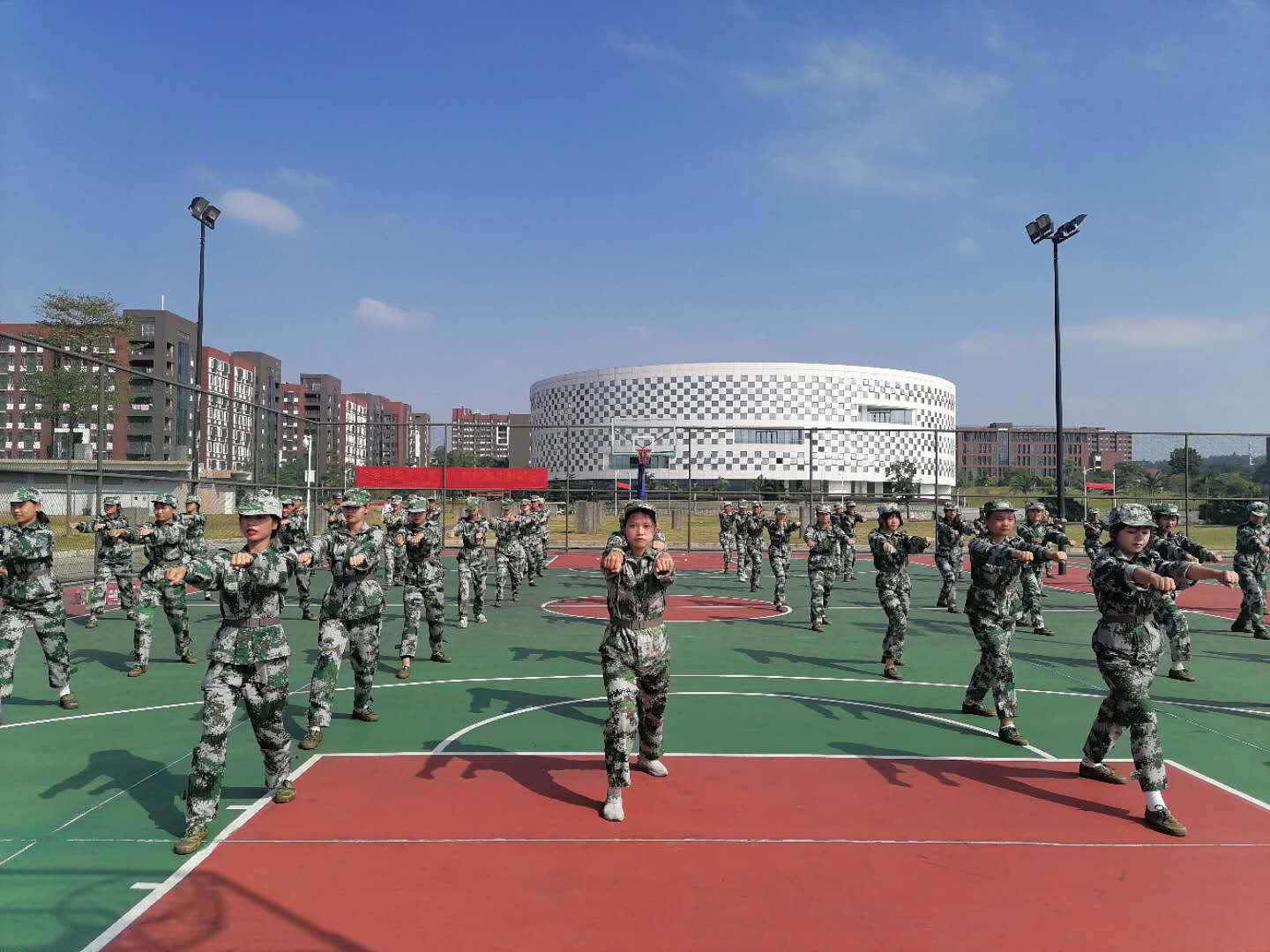 烈日当空,广酒的新生军训迎来了即将结束的一周。还有2天就得进场进行展示了,在剩下的两天时间里面,各个方阵都在认认真真、紧锣密鼓地在排练。其中有一个特别的方阵,军体拳女子方阵。作为全是女生的方阵队伍,完全没有输给男生的军训方阵。头顶烈日,刚强坚毅。