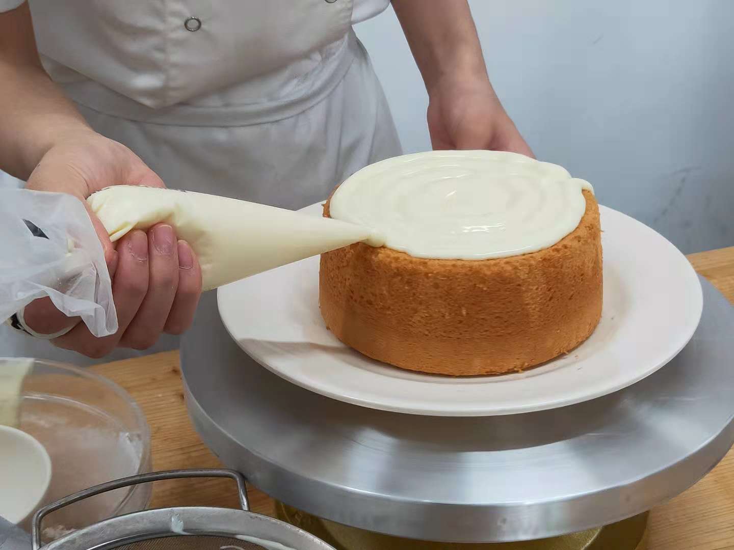 教师演示海盐奶盖芝士蛋糕 学生观看并学习