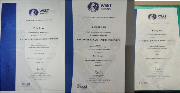 同学们获得的WSET2、WSET3证书