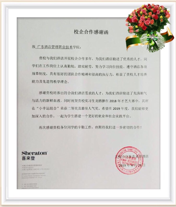 【本院消息】近日,我校收到一封来自深圳大梅沙京基喜来登酒店的“感谢信”,信中说:广酒学院在该酒店实习的学生,在工作岗位上认真勤勉、踏实耐劳,努力学习岗位技能,遵守酒店的各项规章制度,具有很好的团队合作精神和很强的执行力,彰显了广酒学院先进的教育理念和人才培养模式。信中特别提到实习生龙鹏翀同学,在2018年才艺大赛中,带领“小幸运组合”荣获二等奖和最佳人气奖!酒店为此感谢我校培养符合酒店业需求的人才,为酒店输送充满朝气和活力的新鲜血液。