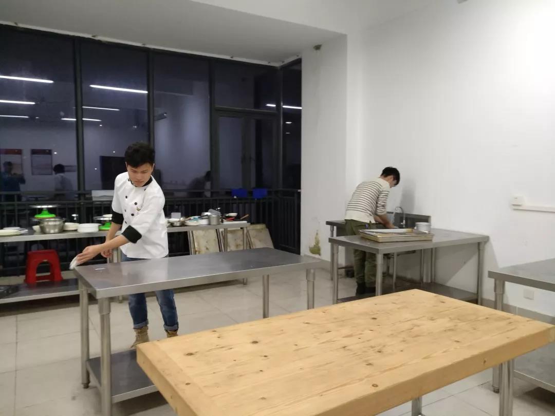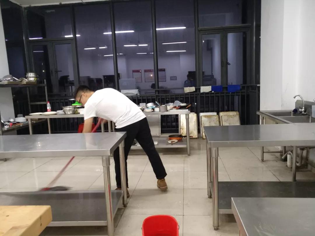结束考核后已是傍晚七点许,负责轮值清洁的二组一点儿又不含糊,脱下厨师服,撸起袖子,拎起工具就干活。