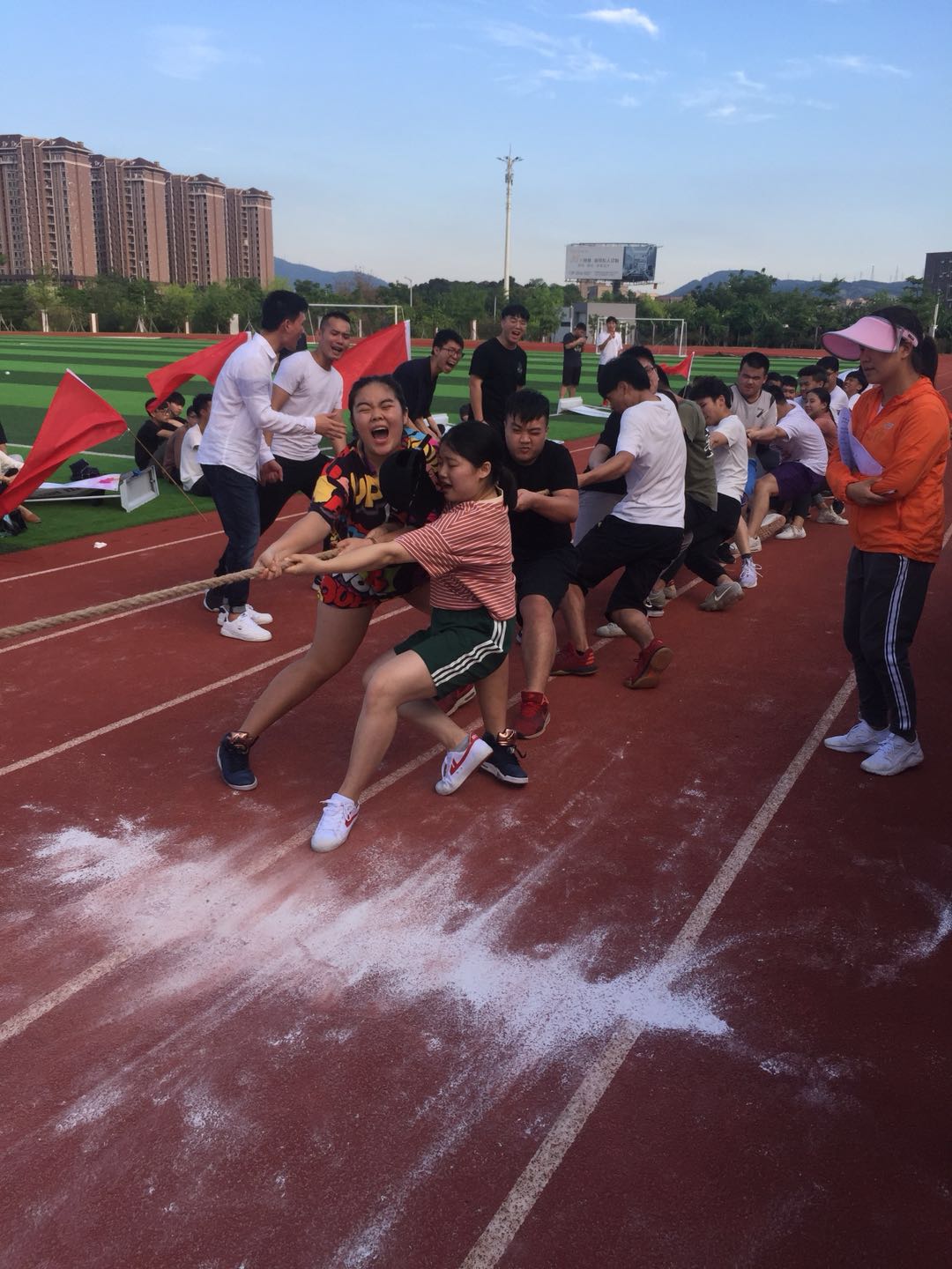 烈日当空,但赛场上的同学们个个胸有成竹,士气磅礴,看他们矫健的身影,团结向上的热情充分体现了我系青年学子的朝气。伴随着一声哨响,比赛开始了,大家都使出了全身的力气。经过几个回合激烈的比拼,体艺系一队获得一名, 烹饪系一队和二队分获第二、三名。最后,三支获奖队伍共同留影作为纪念,广酒第一届拔河比赛圆满结束。