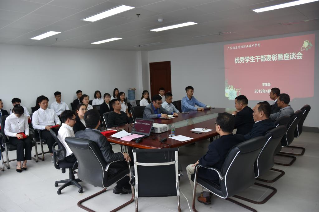 座谈会由校团委书记王克明主持。会议伊始,副校长卢东亮宣读《广东酒店管理职业技术学院关于表彰优秀学生干部的决定》(广酒学〔2019〕04号)文件。随后,校长范秀仁,党委书记、副校长戴炳源,副校长李光玉、卢东亮,校务委员王敏依次为获奖的学生干部颁发荣誉证书。