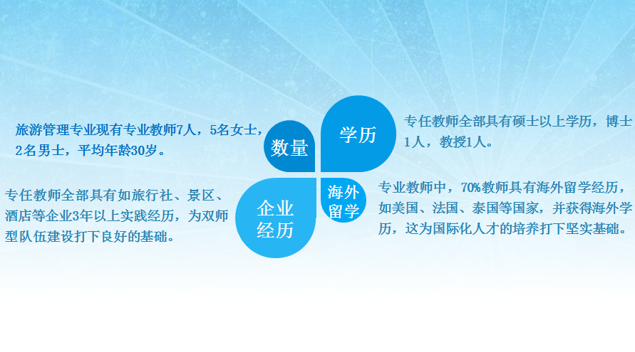 酒店旅游系的教师队伍均具有旅游与酒店管理专业教育背景及行业工作经验,具有研究生及以上学历。半数以上的教师具有海外留学经历,如法国、美国、瑞士、马来西亚等。