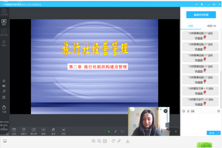 陈露露老师本学期担任《导游实务》及《旅行社经营与管理》两门专业课教学工作。今年是困难的一年,也是教师教学方式改革创新得以实施的一年。疫情使得我们不得以从线下教学转变为线上教学模式,为适应新的教学模式,现将教学理论部分线上完成,实践操作部分等疫情结束返校后,课堂上展示完成。