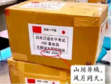 一方有难八方支援,2020年2月,日本汉语水平考试事务所捐赠给湖北20000个口罩和一批红外体温计,物资外包装的标签上写着八个字:“山川异域,风月同天”。 我们不在同一个地方,未享同一片山川。但当我们抬头时,看到的是同一轮明月。