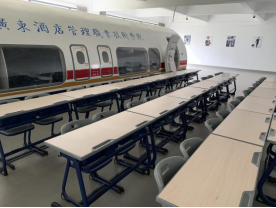 模拟舱的尺寸为:长14.5米、舱体宽4米、高2.59米;自重空载20吨,舱内共设48个座椅,分别为36个经济舱座椅、8个头等舱座椅和4个乘务员座椅,同时可容纳40人进行实训操作,真实展现乘务人员的工作环境,学生在模拟机舱里进行实训,可最大限度模拟真实上机情景,掌握规范的服务礼仪。