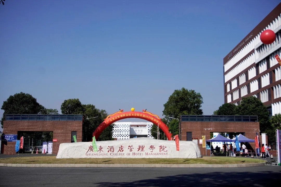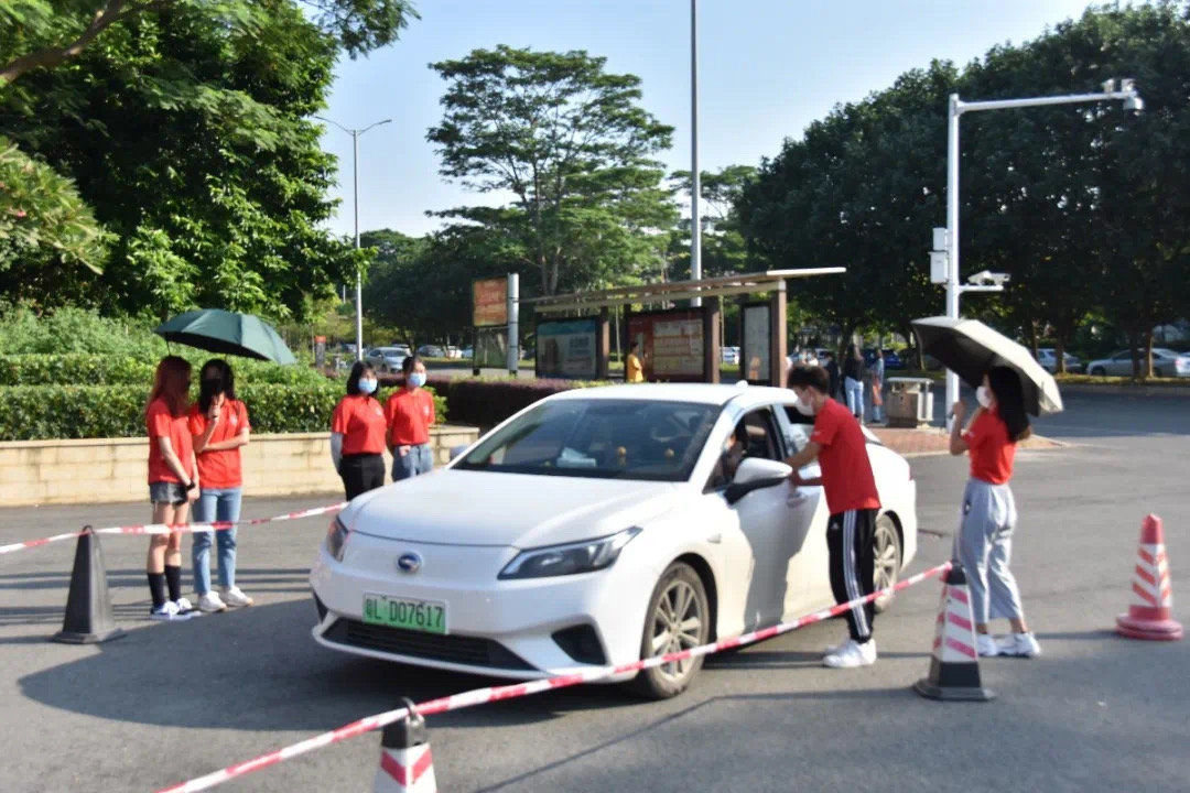 学校大门口,学生会的工作人员和志愿者们在帐篷下热情地等待新生的到来,不时会用喇叭喊着“广酒学院欢迎你”,以防新生找不到校门口的迎新团队。