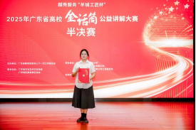 近日,广东省“金话筒”公益讲解大赛(半决赛)在广州落下帷幕。广东酒店管理职业技术学院酒店管理学院24级会展策划与管理1班学生杜炳兰,在指导老师谭黎君的悉心指导下,凭借出色的讲解能力和沉稳的现场表现,荣获“优秀讲解员”称号。